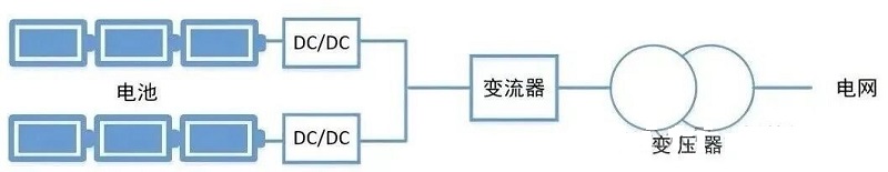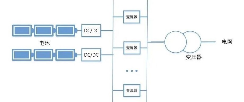 · Core Concept: DC/DC + Centralized PCS. Adds a DC optimizer (DC/DC converter) in front of each battery cluster before they feed into a centralized PCS.
