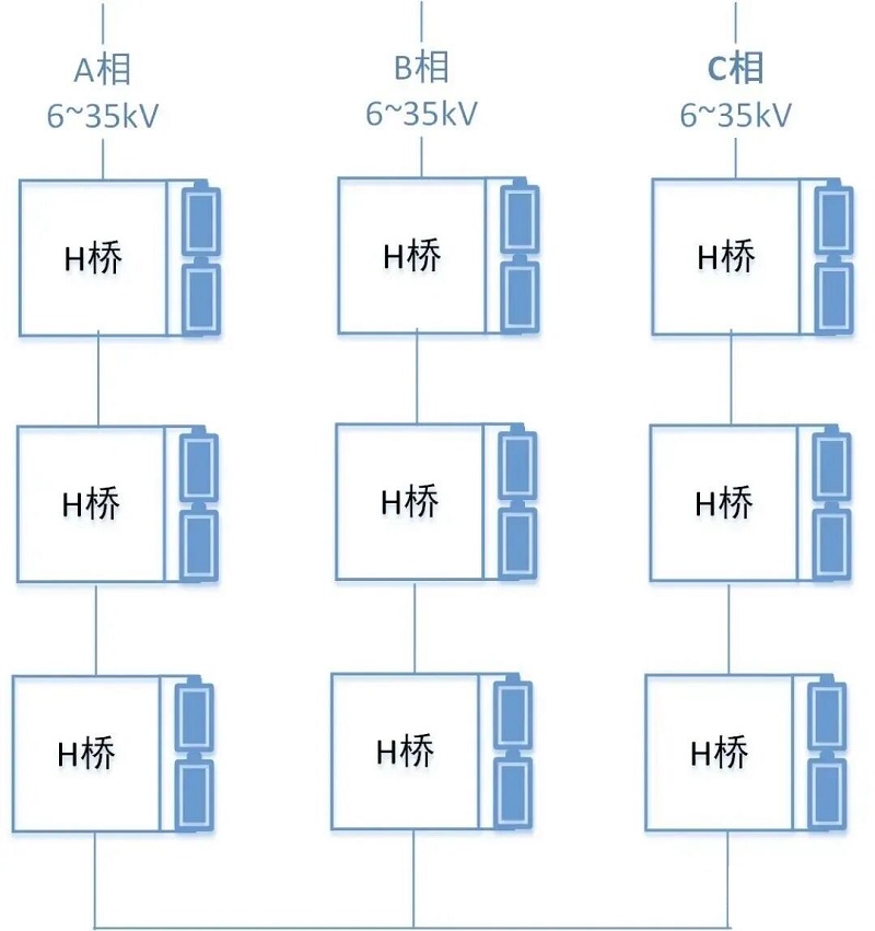 · Core Concept: Direct High-Voltage AC. Multiple power cell modules (with H-bridges) are cascaded in series to directly output medium-voltage AC (e.g., 10kV or 35kV) without a line-frequency transformer.