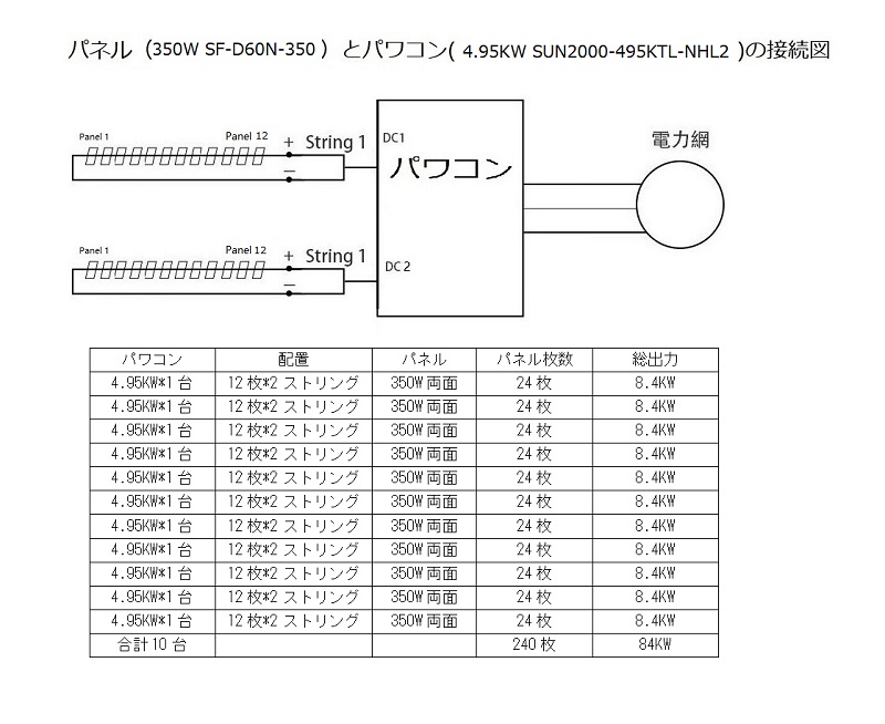 – 350W: 240 panels total, 84.0kW total capacity (24 panels per unit, 2-string configuration)